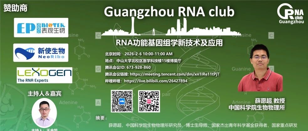 会议介绍报告时间(中国北京):2026-4-17 14:00-15:00新使生物作为广州RNA club的受邀赞助商,积极支持和转发会议。新使生物视频号将于4月17日 14:00同步直播陈雪梅院士《5' capping of RNA with cellular metabolites》的精彩报告。摘要陈雪梅教授1988年获得北京大学生物学学士学位,1995年...