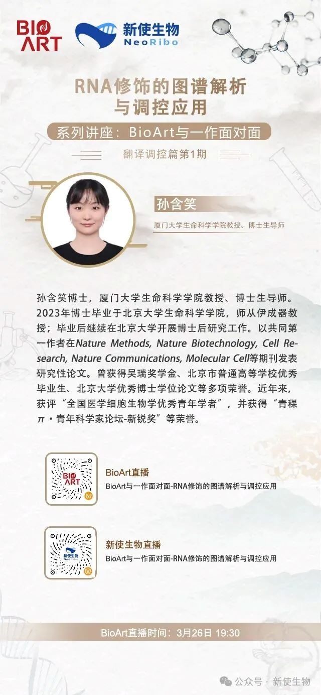 本周“一作论坛”为翻译调控篇,时间是3月26日19:30,由厦门大学生命科学学院教授、博士生导师孙含笑报告,题目为:RNA修饰的图谱解析与调控应用,届时欢迎大家参加直播。