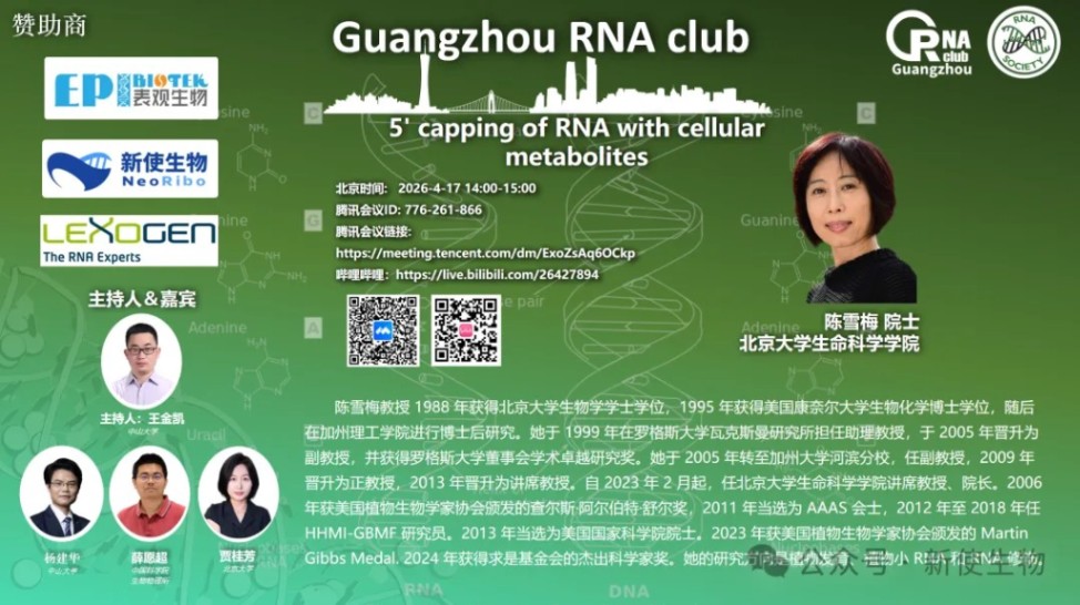 会议介绍报告时间(中国北京):2026-4-17 14:00-15:00新使生物作为广州RNA club的受邀赞助商,积极支持和转发会议。新使生物视频号将于4月17日 14:00同步直播陈雪梅院士《5' capping of RNA with cellular metabolites》的精彩报告。摘要陈雪梅教授1988年获得北京大学生物学学士学位,1995年...